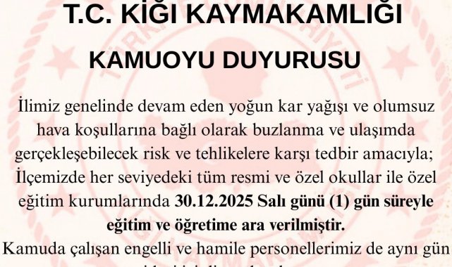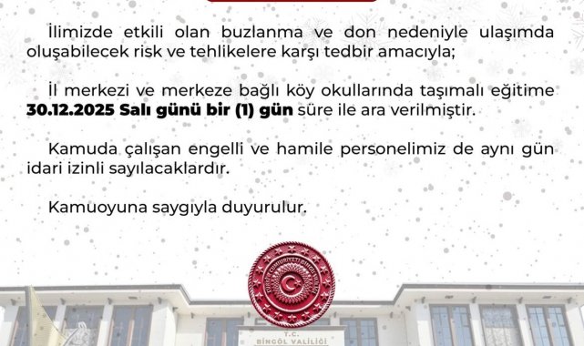 Bingöl Valiliği'nden yapılan açıklamada, "İlimizde etkili olan buzlanma ve don nedeniyle ulaşımda oluşabilecek risk ve tehlikelere karşı tedbir amacıyla; il merkezi ve merkeze bağlı köy okullarında taşımalı eğitime 30.12.2025 Salı günü bir (1) gün süre ile ara verilmiştir. Kamuda çalışan engelli ve hamile personelimiz de aynı gün idari izinli sayılacaklardır" denildi.