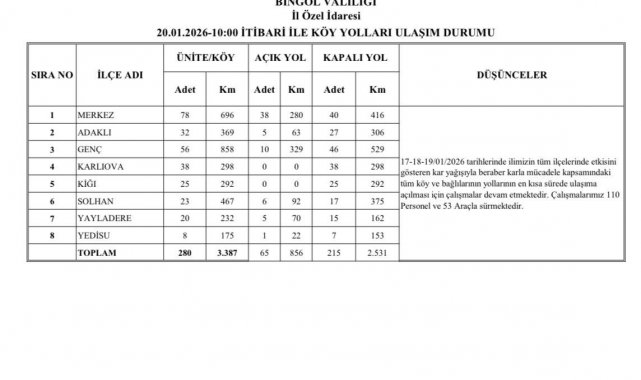Bingöl İl Özel İdaresi koordinesinde yürütülen çalışmalar kapsamında, il genelinde karla mücadele ağı içerisinde bulunan köy ve bağlılarının yollarının en kısa sürede ulaşıma açılması için 110 personel ve 53 araç sahada görev yapıyor. Ekiplerin yoğun çalışmaları sonucunda gün içerisinde birçok köy yolu ulaşıma açılırken, şu an itibarıyla 65 köy yolu açık, 215 köy yolu ise kapalı durumda bulunuyor.