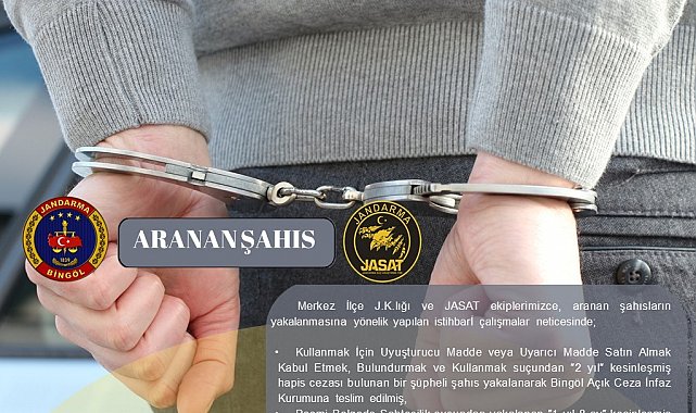 Bingöl Merkez İlçe Jandarma Komutanlığı ve JASAT ekiplerince aranan şahısların yakalanmasına yönelik çalışma gerçekleştirildi. Bu çerçevede kullanmak için uyuşturucu madde veya uyarıcı madde satın almak, kabul etmek, bulundurmak ve kullanmak suçundan 2 yıl kesinleşmiş hapis cezası bulunan şüpheli yakalanarak Bingöl Açık Ceza İnfaz Kurumu'na teslim edildi.