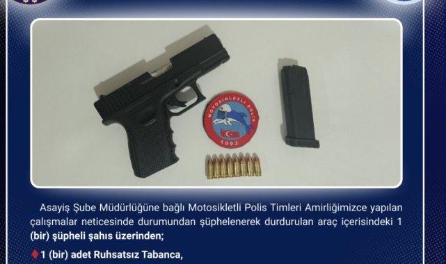 Öte yandan Asayiş Şube Müdürlüğüne bağlı Motosikletli Polis Timleri Amirliğince yapılan çalışmalar neticesinde durumundan şüphelenerek durdurulan araç içerisindeki 1 şüpheli şahıs üzerinden; 1 adet ruhsatsız tabanca, 1 adet şarjör ve 8 adet 9.19 mm çapında fişek ele geçirildiği bildirildi.