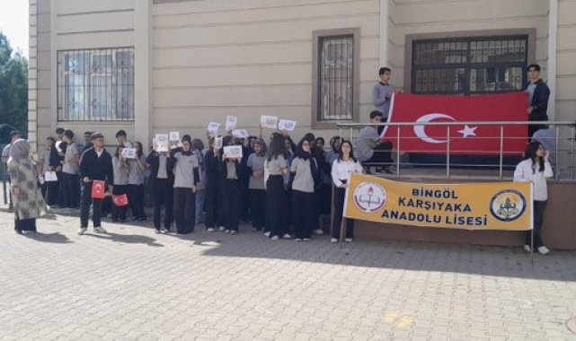 Bingöl Karşıyaka Anadolu Lisesi öğrencileri, Gazze'de yaşanan insan hakları ihlallerine ve soykırıma dikkat çekmek amacıyla anlamlı bir farkındalık etkinliği düzenledi. Okul bahçesinde gerçekleştirilen programda öğrenciler, barış, adalet ve insan onurunun korunması temalı pankartlar taşıyarak etkileyici bir koreografi sergiledi. Etkinlikte ayrıca çeşitli konuşmalar ve şiirler ile Filistin halkına destek mesajları verildi. Okul idaresi gençlerin vicdanı rehber, adaleti pusula edinen bir anlayışla dünyadaki zulümlere sessiz kalmayışına ve bu duyarlılığın gelecek için büyük bir umut kaynağı olduğuna değindi.