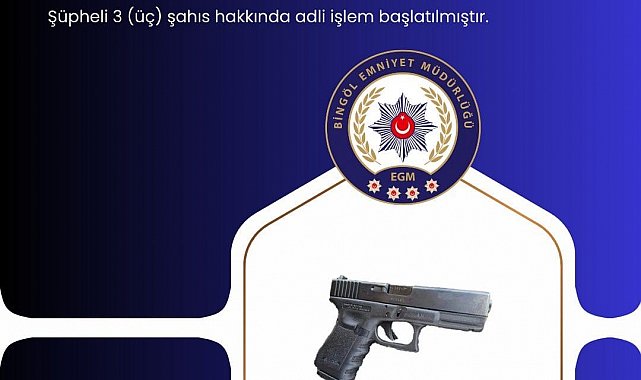 Bingöl Emniyet Müdürlüğü Asayiş Şube Müdürlüğü motosikletli polis timlerince yapılan çalışmalar neticesinde 1 adet Glock Gen Austria marka ruhsatsız tabanca, 1 adet şarjör ve 11 adet 9 çarpı 19 milimetre çapında dolu fişek ele geçirildi. Olaya ilişkin şüpheli 3 kişi hakkında adli işlem başlatıldı.
