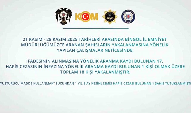 Bingöl İl Emniyet Müdürlüğü ekipleri, kent genelinde huzur ve güven için çalışmalarını aralıksız sürdürüyor. Bu çerçevede 21-28 Kasım tarihleri arasında yapılan çalışmalarda aranan 18 şüpheli yakalandı. Ayrıca TEM, KOM, Narkotik ve Siber Suçlarla Mücadele ile Asayiş Şube Müdürlükleri tarafından yapılan çalışmalarda 17 şüphelinin yakalandığı bildirildi. Çalışmalarda 8,07 gram kubar esra, 1,55 gram metamfetamin, kaçak sigara ve tütün, 1 adet av tüfeği, 1 adet ruhsatsız tabanca, 1 adet sahte plakalı aracın ele geçirildiği aktarıldı.