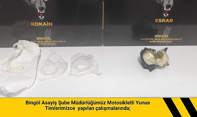 Bingöl Emniyet Müdürlüğü Asayiş Şube Müdürlüğü motosikletli yunus timlerince yapılan çalışmalar neticesinde 20 gram toz esrar ile 5 gram kokain ele geçirildi. 2 şüpheli hakkında adli işlem başlatıldı.