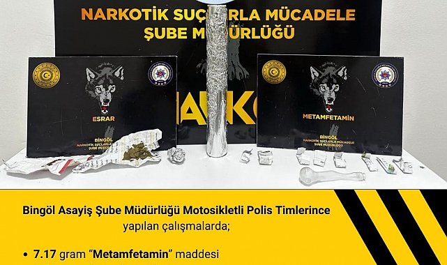 Bingöl'de İl Emniyet Müdürlüğü ekipleri kent genelinde çalışmalarını aralıksız sürdürüyor. Bu çerçevede yapılan çalışmalarda 7.17 gram Metamfetamin, 1.55 gram esrar, 2.48 gram toz esrar, 5.78 gram kenevir tohumu ele geçirilirken 1 şüpheli tutuklandı. Aynı zamanda Karlıova ilçesinde yapılan çalışmalarda ise 4.5 gram kubar esrar maddesi ele geçirilirken 1 şüpheli hakkında adli işlem başlatıldı.