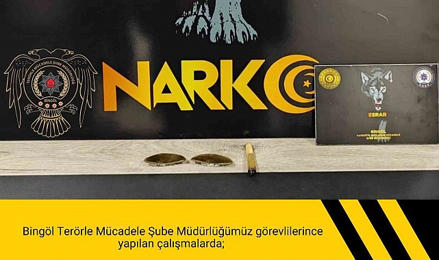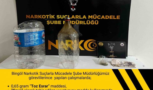 Bingöl İl Emniyet Müdürlüğü ekipleri, uyuşturucuyla mücadele çalışmalarını aralıksız sürdürüyor. Bu çerçevede yapılan 3 ayrı çalışmada toplam, 2.27 gram toz esrar maddesi, 5.21 gram plaka esrar maddesi, 0.78 gram tütüle karıştırılmış esrarlı sigara, 'Kova' olarak tabir edilen uyuşturucu madde kullanımında kullanılan düzenek ele geçirildi. Çalışmalarda toplamda 6 şüpheli şahıs hakkında adli işlem başlatıldığı bildirildi.