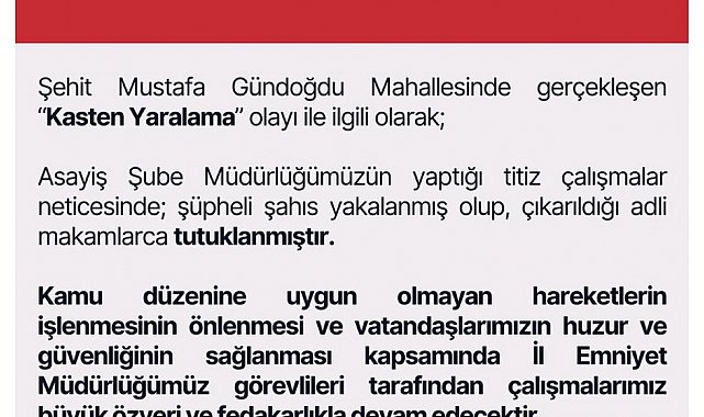 Bingöl İl Emniyet Müdürlüğü'nden yapılan açıklamada, "Şehit Mustafa Gündoğdu Mahallesinde gerçekleşen 'Kasten Yaralama' olayı ile ilgili olarak; Asayiş Şube Müdürlüğümüzün yaptığı titiz çalışmalar neticesinde; şüpheli şahıs yakalanmış olup, çıkarıldığı adli makamlarca tutuklanmıştır. Kamu düzenine uygun olmayan hareketlerin işlenmesinin önlenmesi ve vatandaşlarımızın huzur ve güvenliğinin sağlanması kapsamında İl Emniyet Müdürlüğümüz görevlileri tarafından çalışmalarımız büyük özveri ve fedakarlıkla devam edecektir" denildi.