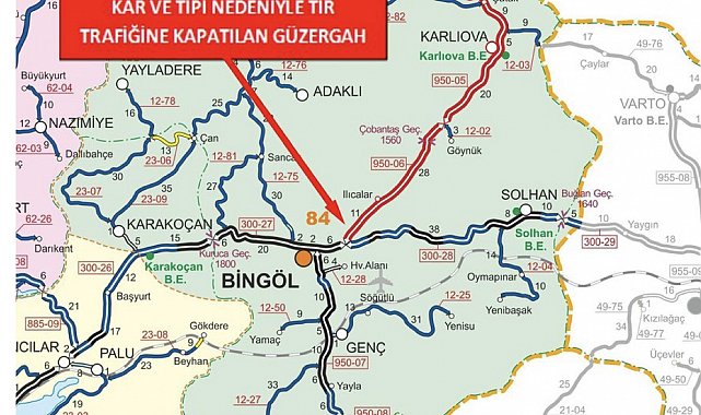 Bingöl Valiliği'nden yapılan açıklamada, "Bingöl-Erzurum Devlet Yolunun 0-88 km'leri arası (Kervansaray kavşağı ile Bingöl-Erzurum İl sınırı arası) yoğun kar yağışı ve tipi nedeniyle saat 15:55 itibarıyla tır trafiğine kapatılmıştır"denildi.