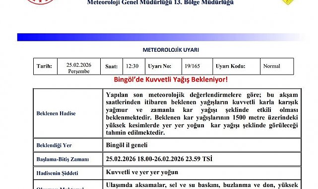 Meteoroloji 13. Bölge Müdürlüğü'nden yapılan açıklamada, "Yapılan son meteorolojik değerlendirmelere göre; bu akşam saatlerinden itibaren beklenen yağışların kuvvetli karla karışık yağmur ve zamanla kar yağışı şeklinde etkili olması beklenmektedir. Beklenen kar yağışlarının 1500 metre üzerindeki yüksek kesimlerde yer yer yoğun kar yağışı şeklinde görüleceği tahmin edilmektedir. Ulaşımda aksamalar, sel ve su baskını, buzlanma ve don, yüksek kesimlerde tipi ile birlikte görüş mesafesinde azalma gibi olumsuzluklara karşı dikkatli ve tedbirli olunmalıdır" denildi.