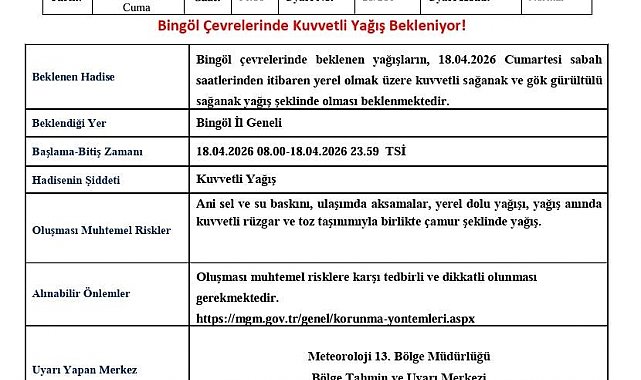 Meteoroloji 13. Bölge Müdürlüğü'nden yapılan açıklamada, "Bingöl çevrelerinde beklenen yağışların, 18.04.2026 Cumartesi sabah saatlerinden itibaren yerel olmak üzere kuvvetli sağanak ve gök gürültülü sağanak yağış şeklinde olması beklenmektedir. Oluşması muhtemel riskler; ani sel ve su baskını, ulaşımda aksamalar, yerel dolu yağışı, yağış anında kuvvetli rüzgar ve toz taşınımıyla birlikte çamur şeklinde yağıştır. Oluşması muhtemel risklere karşı tedbirli ve dikkatli olunması gerekmektedir" denildi.