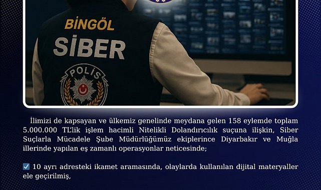 Bingöl İl Emniyet Müdürlüğü, ülke genelinde meydana gelen 158 eylemde toplam 5 milyon TL'lik işlem hacimli "nitelikli dolandırıcılık" suçuna ilişkin çalışma yaptı. Siber Suçlarla Mücadele Şube Müdürlüğü ekiplerince Diyarbakır ve Muğla illerinde yapılan eş zamanlı operasyonlar neticesinde; 10 ayrı adreste operasyon düzenlendi. Operasyonda 9 şüpheli gözaltına alındı. Bingöl'e getirilen şüphelilerden 4'ü savcılık tarafından biri ise adli kontrol kararı ile serbest bırakıldı. 4 şüpheli ise tutuklanarak cezaevine gönderildi.