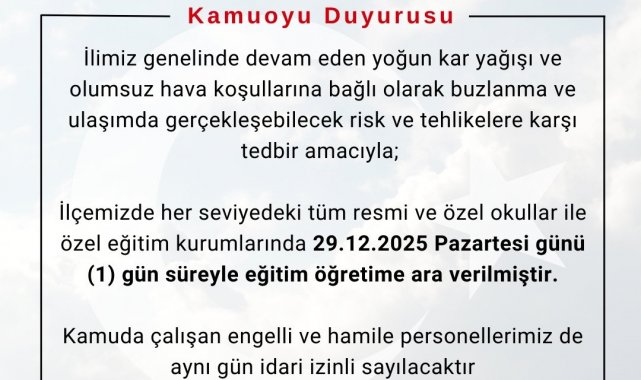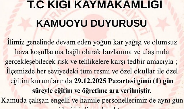 Kiğı Kaymakamlığı ve Adaklı Kaymakamlığı tarafından yapılan açıklamada, devam eden yoğun kar yağışı, buzlanma ve ulaşımda yaşanabilecek riskler nedeniyle tedbir amaçlı karar alındığı aktarıldı. Buna göre, 29 Aralık 2025 Pazartesi günü ilçelerdeki her seviyedeki tüm resmi ve özel okullar ile özel eğitim kurumlarında eğitim ve öğretime 1 gün süreyle ara verildiği bildirildi.