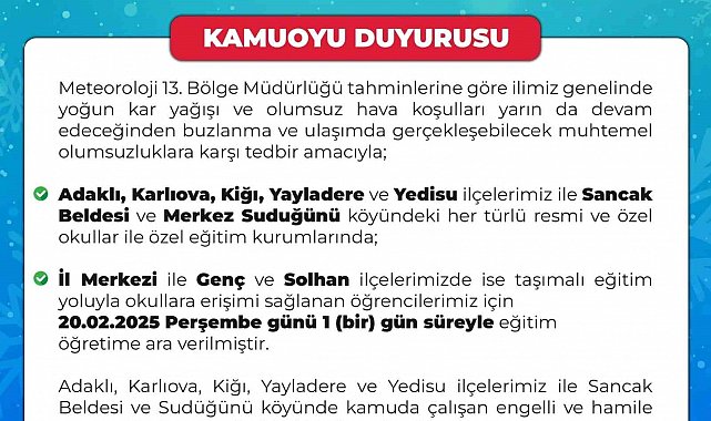 Bingöl Valiliğinden yapılan açıklamada, "Meteoroloji 13. Bölge Müdürlüğü tahminlerine göre ilimiz genelinde yoğun kar yağışı ve olumsuz hava koşulları yarın da devam edeceğinden buzlanma ve ulaşımda gerçekleşebilecek muhtemel olumsuzluklara karşı tedbir amacıyla, Adaklı, Karlıova, Kiğı, Yayladere ve Yedisu ilçelerimiz ile Sancak beldesi ve merkez Sudüğünü köyündeki her türlü resmi ve özel okullar ile özel eğitim kurumlarında, il merkezi ile Genç ve Solhan ilçelerimizde ise taşımalı eğitim yoluyla okullara erişimi sağlanan öğrencilerimiz için 20 Şubat Perşembe günü 1 gün süreyle eğitim öğretime ara verilmiştir. Adaklı, Karlıova, Kiğı, Yayladere ve Yedisu ilçelerimiz ile Sancak beldesi ve Sudüğünü köyünde kamuda çalışan engelli ve hamile personelimiz aynı gün idari izinli saylacaklardır" denildi.