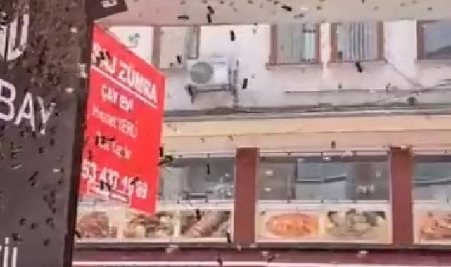 Bursa'da şehir merkezindeki bir iş hanını basan arılar, çalışanları esir aldı. Öğle saatlerinde biranda iş merkezinin girişindeki kepenge toplanan arılar, esnafa da vatandaşa da korku dolu anlar yaşattı. Kimi umursamadan iş merkezine girerken, kimisi ise yolunu değiştirdi.