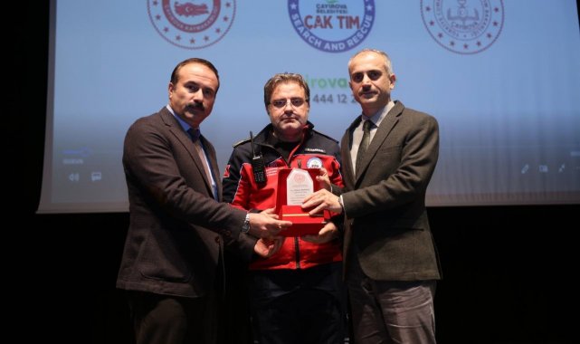 Konuşmaların ardından Çayırova Belediye Başkanı Bünyamin Çiftçi ve Çayırova İlçe Milli Eğitim Müdürü Recep Demir, afet farkındalık eğitimlerini gerçekleştiren ÇAK-TİM Lideri Hüseyin Narman'a plaket takdim etti.