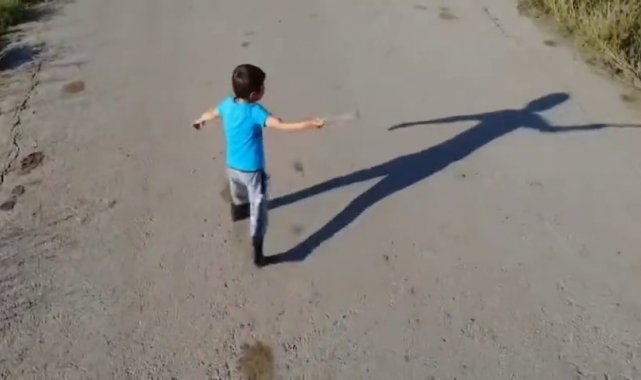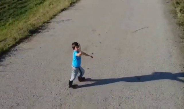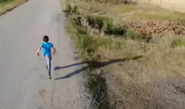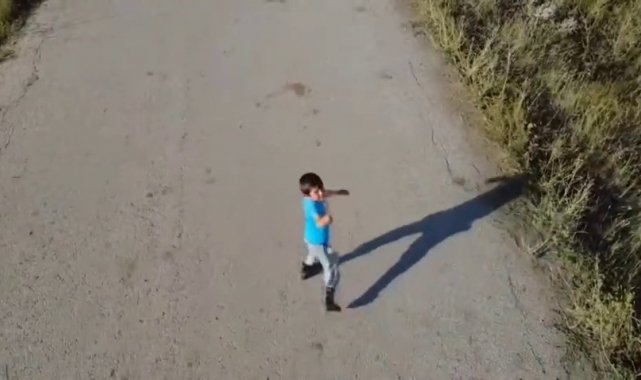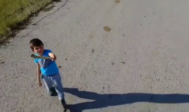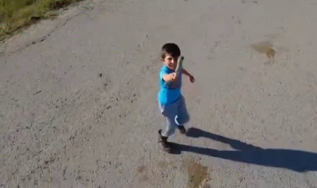Erzurum'un sosyal ve kültürel yaşantısı ile ilgili paylaşımlar yapan bir sosyal medya hesabı adına Aziziye ilçesine bağlı Alaybeyi Köyü'nde çekim yapan ekibin ilgisini bir çocuk çekti. Elindeki sopa ile köy yolunda yürüyen çocuk, kendisine yaklaşan drone yakalamaya çalıştı ama başarılı olamadı. Kimi zaman yol üzerinde hızla kaçmaya çalışan çocuk drone kendisine yaklaşınca durup sopa ile vurmaya çalıştı.