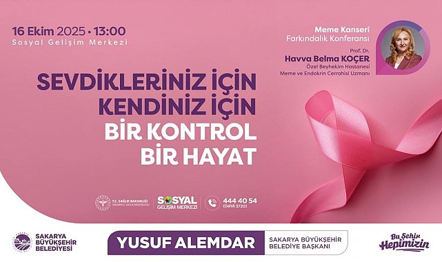 Sakarya Büyükşehir Belediyesi ve İl Sağlık Müdürlüğü'nün iş birliği ile 16 Ekim Perşembe günü "Sevdikleriniz İçin, Kendiniz İçin: Bir Kontrol Bir Hayat" adlı meme kanseri farkındalık konferansı düzenlenecek. Prof. Dr. Havva Belma Koçer konuşmacı olarak katılacağı program saat 13.00'da SGM'de gerçekleştirilecek.