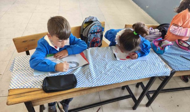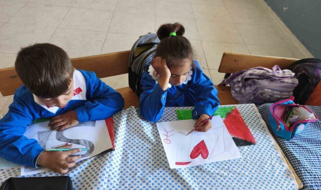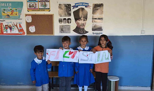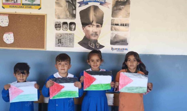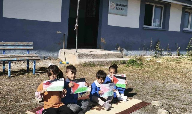 Köy okulunda okuyan minik öğrenciler, öğretmenlerinin rehberliğinde büyük bir duyarlılıkla Filistin'de yaşanan insan hakları ihlallerine dikkat çekti.