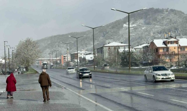 Düzce'de bazı bölgelerde hem güneş hem kar yağışı etkili oluyor. Aralarında sadece 4 kilometre olan iki bölgenin birinde yoğun kar yağışı diğer bölgede ise güneş bölgeyi etkiliyor.