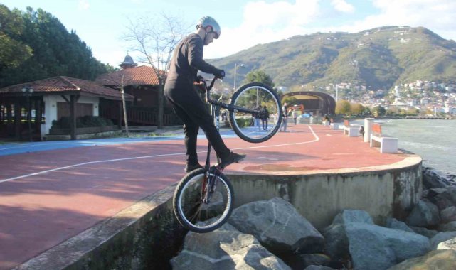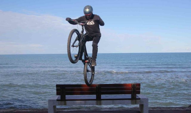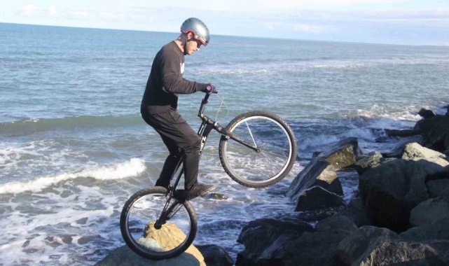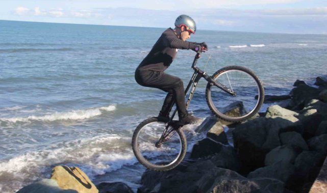 Ordu'da bisiklet tutkunu bir genç, yurt dışından getirttiği özel yapım trial bisikletiyle deniz kenarındaki kayalıklarda yaptığı akrobatik hareketlerle dikkat çekiyor.