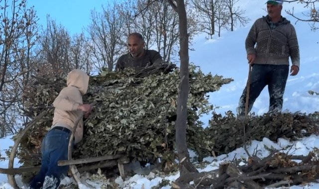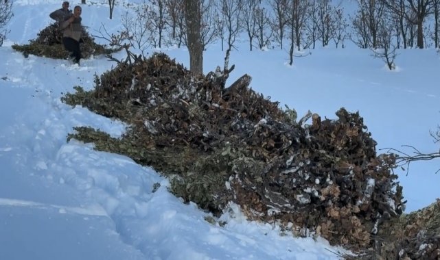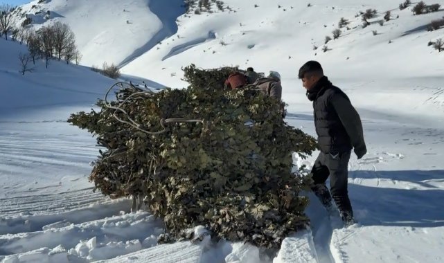Bitlis'te yazın dağlık alanlarda toplanan yapraklı meşe dalları, kışın karlı yamaçlardan kızaklarla indirilerek hayvanlara veriliyor.