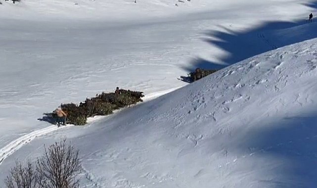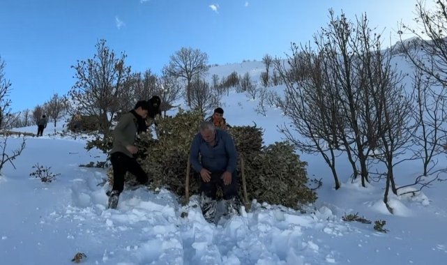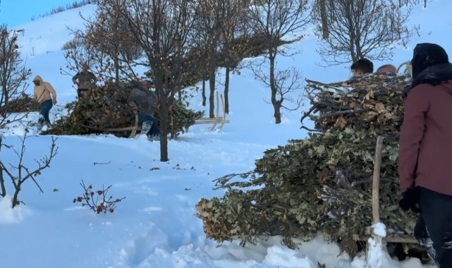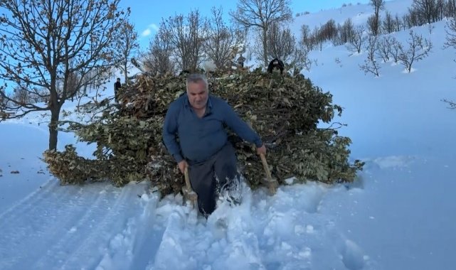 Karlı ve engebeli arazilerde kızaklara yüklenen meşe yaprakları, köylüler tarafından hayvan barınaklarına kadar çekiliyor. Köylüler, bu yöntemin yıllardır kullanılan geleneksel bir çözüm olduğunu ve kış aylarında hayvancılığın devamı için büyük önem taşıdığını belirtiyor.