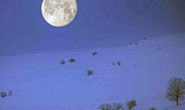 Bitlis'te karlı dağlarla bütünleşen ay manzarası mest etti
