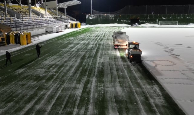 Bitlis'te maç öncesi sahada karla mücadele çalışması