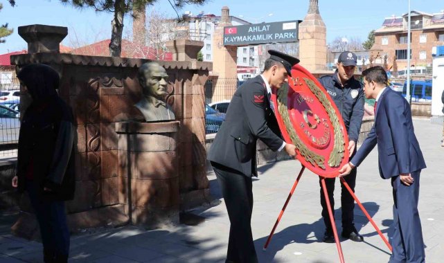 Ahlat Kaymakamlığı önündeki Atatürk büstüne çelenklerin sunulması, saygı duruşu ve İstiklal Marşı'nın okunmasıyla başlayan tören, daha sonra Ahlat Halk Eğitim Merkezinde Yunus Ensari İlköğretim Okulu'nun düzenlediği programla devam etti