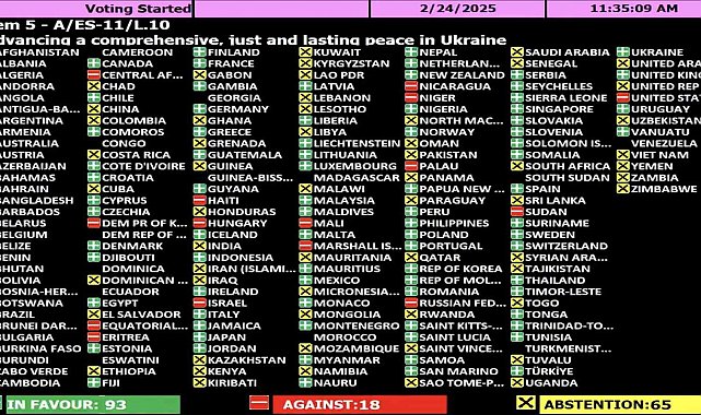 BM Genel Kurulunda, Rusya-Ukrayna savaşının 3'üncü yıldönümünde Rusya'nın Ukrayna'dan derhal ve şartsız olarak askerlerini geri çekmesini talep eden karar tasarısı oylandı. Tasarı 93 "evet" oyuyla kabul edilirken, aralarında ABD'nin de bulunduğu 18 ülke karara "hayır" oyu verdi. 65 ülke ise çekimser kaldı.