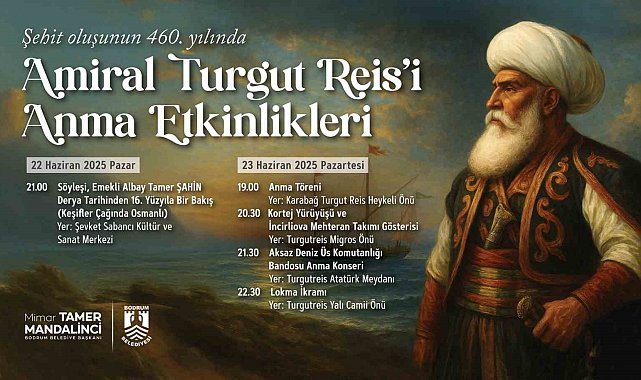 Tarihi mirasa sahip çıkmak ve Amiral Turgut Reis'i gelecek nesillere tanıtmak amacıyla Bodrum Belediyesi Kültür ve Sosyal İşler Müdürlüğü organizasyonuyla 22-23 Haziran tarihlerinde anma etkinlikleri gerçekleştirilecek.