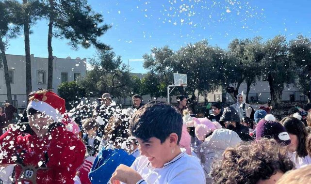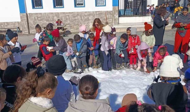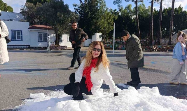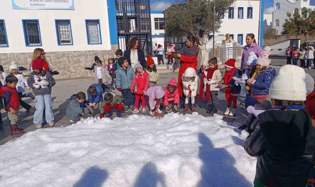 Muğla'nın Bodrum ilçesinde bir ilkokula getirilen yapay kar ile çocuklar gönüllerince eğlendi.