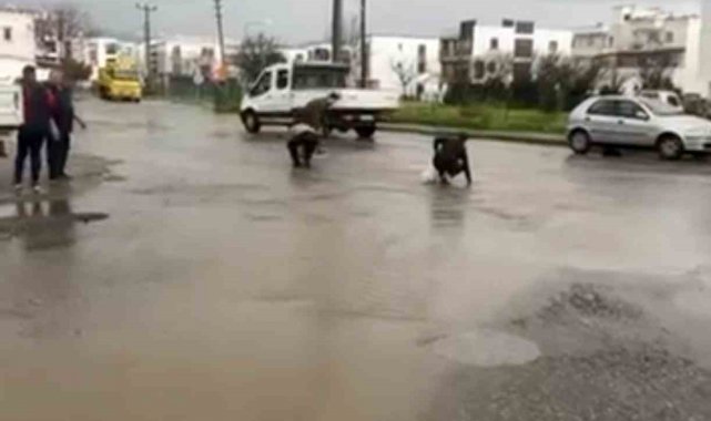 Bodrum'da etkili olan sağanak yağış, Mumcular Mahallesi'nde yaşamı olumsuz etkiledi. Yağışın şiddetini artırmasıyla birlikte Mumcular Mustafa Kalem Parkı'ndaki gölet taşarken, çevredeki alanlar kısa sürede sular altında kaldı. Göletten taşan sularla birlikte balıkların asfalta sürüklendiği anlar, çevredeki vatandaşları hayrete düşürdü. Yolda çırpınan balıkları gören bazı vatandaşlar, canlıları kurtarmak için seferber olurken bazıları ise yemek için yoldan balık topladı.