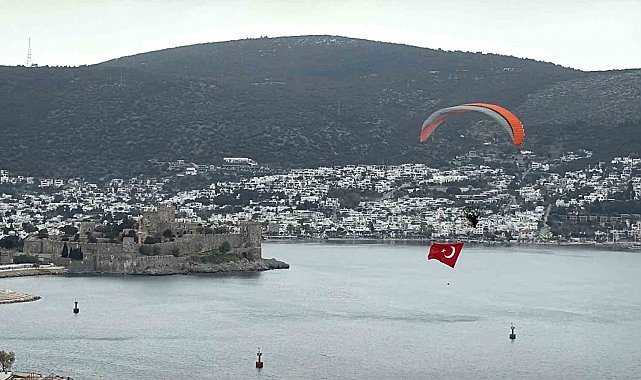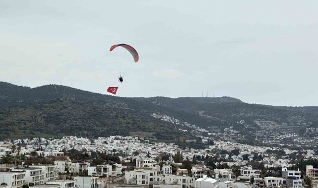 Muğla'nın Bodrum ilçesinde 18 Mart Şehitleri Anma Günü ve Çanakkale Deniz Zaferi'nin yıl dönümünde gökyüzü kırmızı beyaza büründü. Paramotorla yapılan uçuşta açılan dev Türk bayrağı, ilçe semalarında dikkat çekerken sahildeki vatandaşlar ve turistler o anları ilgiyle izledi.
