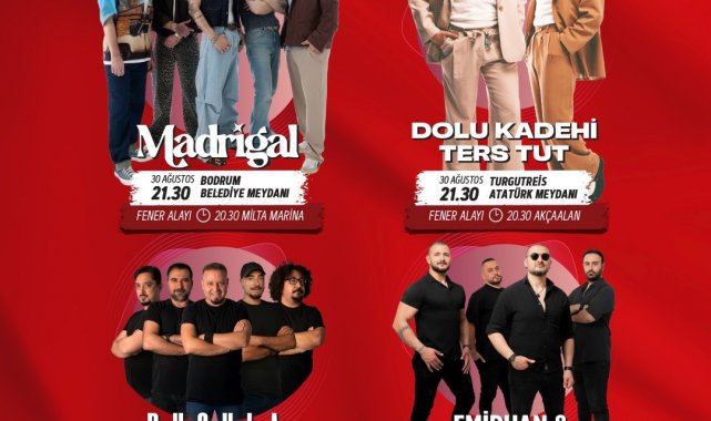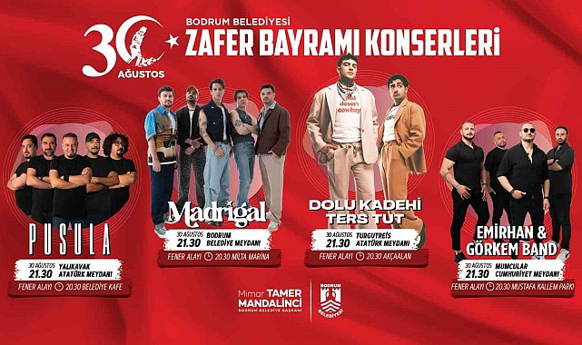 30 Ağustos Zafer Bayramı kutlama programları Bodrum Merkez'de Bodrum Milta Marina'dan başlayarak Bodrum Belediye Meydanı'na kadar fener alayı düzenlenecek. Fener alayının ardından "Madrigal" grubu sahne alacak. Yalıkavak Mahallesi'nde Belediye Kafe önünden başlayacak fener alayı, Yalıkavak Atatürk Meydanı'nda sona erecek. Ardından "Pusula" grubu konser verecek. Turgutreis Mahallesi'nde ise Akçaalan Çok Amaçlı Salon'dan başlayarak Turgutreis Atatürk Meydanı'na kadar fener alayı yapılacak. Etkinlik, "Dolu Kadehi Ters Tut" grubunun konseriyle devam edecek. Mumcular Mahalesi'nde Karaova Mustafa Kallem Parkı'ndan başlayacak fener alayı, Mumcular Cumhuriyet Meydanı'nda sona erecek. Sonrasında "Emirhan & Görkem Band" sahne alacak.
