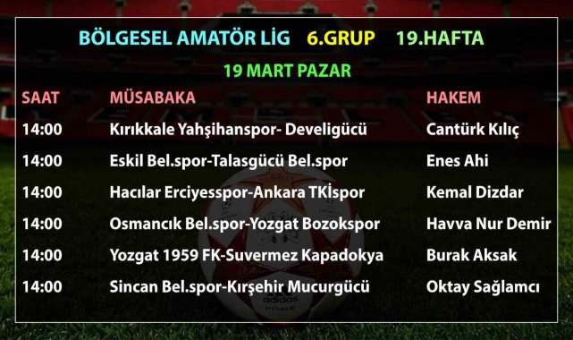 Bölgesel Amatör Lig 6. Grup 19. hafta maçlarında düdük çalacak hakemler ise şu şekilde: