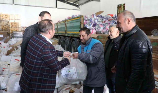 Özcan, içinde temel gıda ve temizlik malzemeleri bulunan kolileri personellere teslim etti.