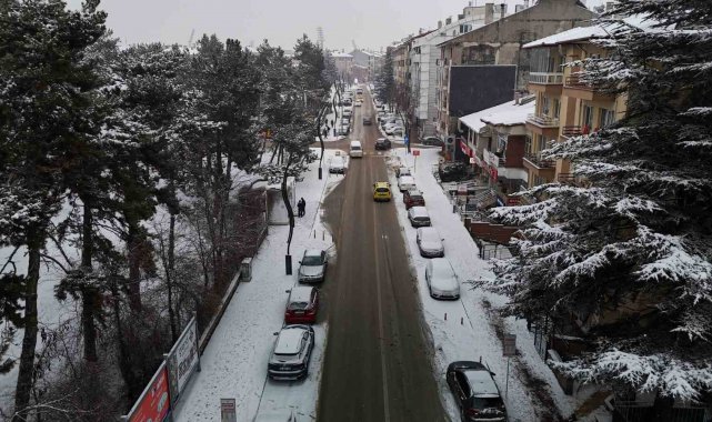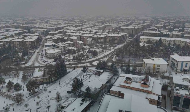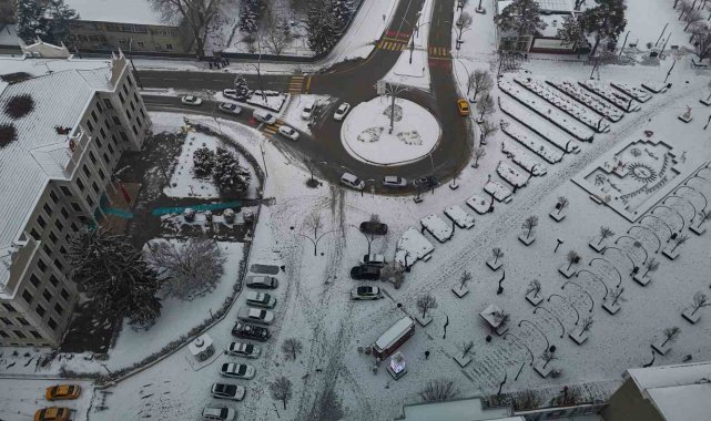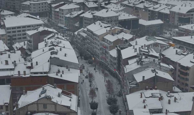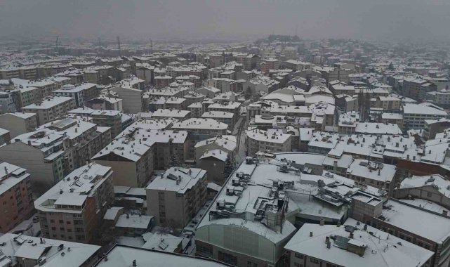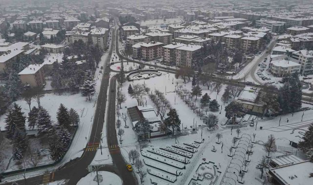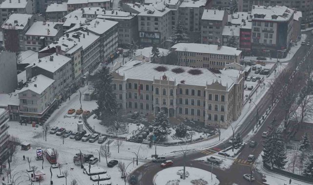 Bolu'da, soğuk havanın etkisiyle birlikte sabah saatlerinde başlayan kar yağışı aralıklarla etkili olmaya devam ediyor. Yağışla birlikte şehir merkezi kısa sürede beyaza büründü. Kentin üzerini kaplayan beyaz örtü, kartpostallık manzaralar oluşturdu. Binaların çatıları, parklar ve yeşil alanlar karla kaplanırken, yağışın oluşturduğu görsel şölen dron ile görüntülendi.