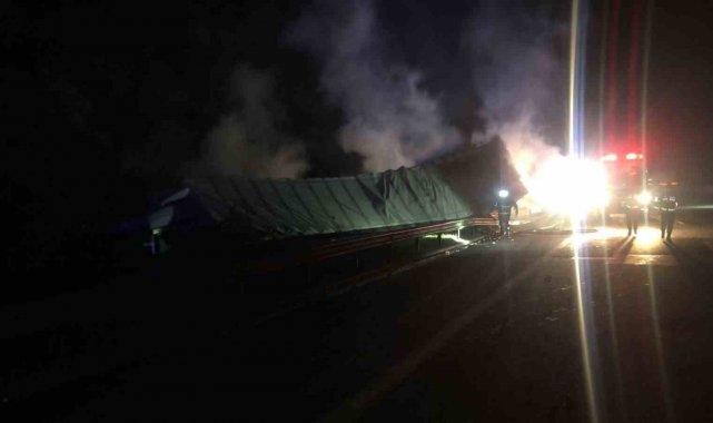 Bolu'da TEM Otoyolu'nda kontrolden çıkan tır, bariyerlere çarptı. Meydana gelen kaza sonrasında tır, dorsesiyle birlikte alev alev yandı.