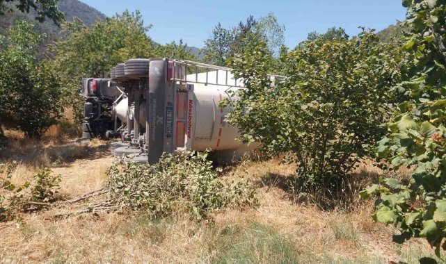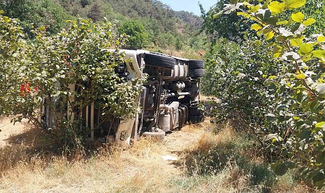 Bolu'nun Mudurnu ilçesinde kontrolden çıkan tır, fındık bahçesine devrildi. Kazayı sürücü yara almadan atlattı.