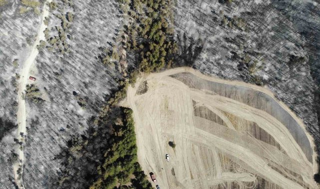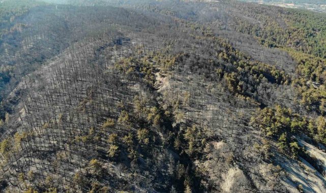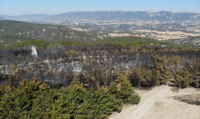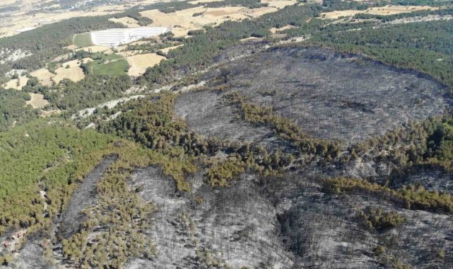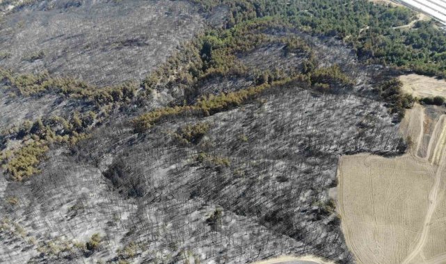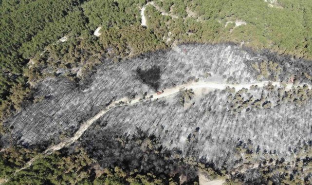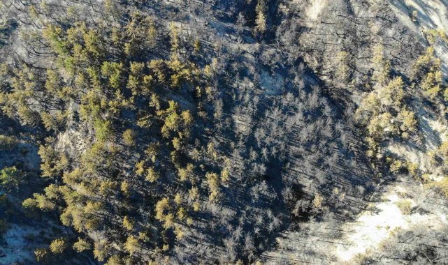 Yangının etki ettiği geniş alan, havadan dronla görüntülendi. Alevlerin küle çevirdiği ormanlık alanın bir kısmı yeşil bir kısmı ise siyaha döndü. Ateş savaşçılarının, çoğu bölgede soğutma çalışmaları sürüyor.