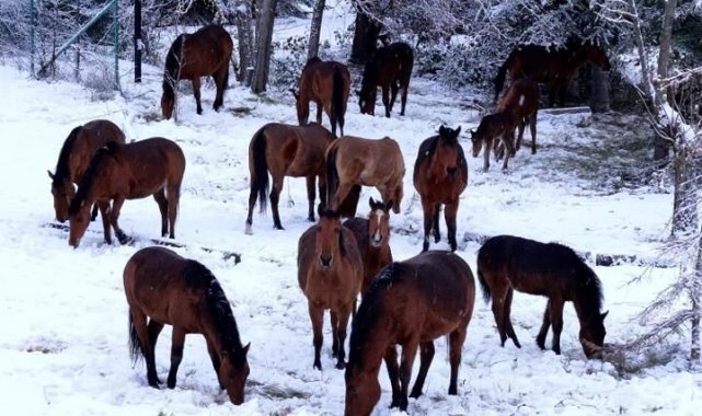 Bolu'da karlı havada yiyecek bulmakta zorlanan yılkı atları şehir merkezine indi. Vatandaşın ihbarı üzerine bölgeye gelen belediye ekipleri, okul bahçesine giren atları samanla besledi.