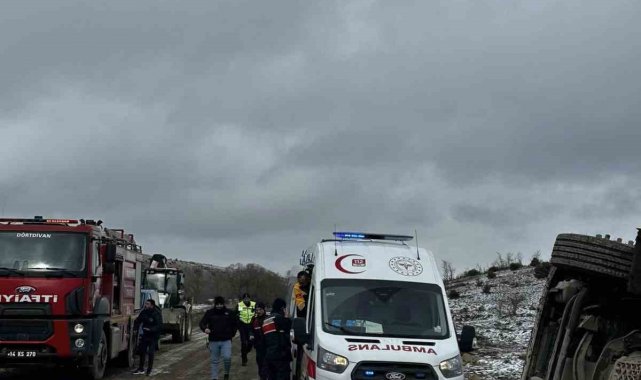 Kaza, Dörtdivan ilçesine bağlı Yalacık köyü mevkisinde öğle saatlerinde meydana geldi. Edinilen bilgiye göre, sürücüsünün ismi henüz öğrenilemeyen 54 AGT 774 plakalı tomruk yüklü tır, kar yağışı nedeniyle kayganlaşan toprak yolda kontrolden çıkarak devrildi. Kazayı gören diğer sürücüler durumu 112 Acil Çağrı Merkezi'ne bildirdi. İhbar üzerine olay yerine itfaiye, sağlık ve jandarma ekipleri sevk edildi. Kazada araç içerisinde sıkışan sürücü, itfaiye ekiplerinin çalışması sonucu bulunduğu yerden çıkarılarak sağlık ekiplerine teslim edildi. Yaralı sürücü, olay yerindeki ilk müdahalesinin ardından hastaneye kaldırıldı.