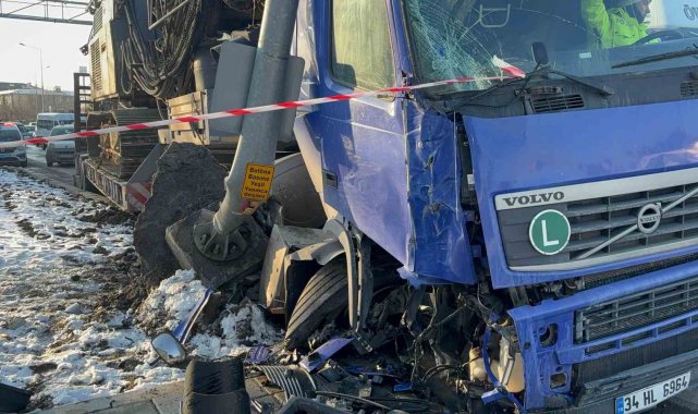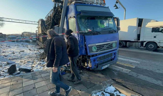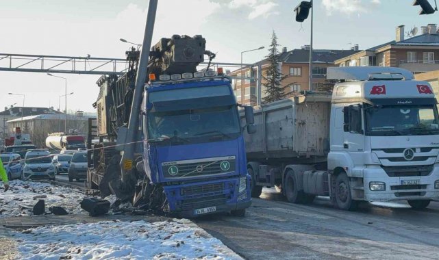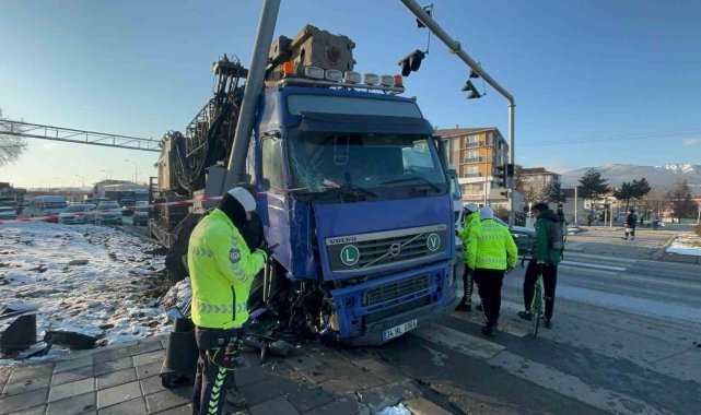 Bolu'da D-100 karayolunda kontrolden çıkan vinç yüklü tır, sinyalizasyon direğine çarptı. Tırın çarptığı demir direk yerinden söküldü.
