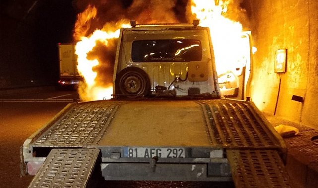 TEM Otoyolu'nun Bolu Dağı Tüneli geçişinde kaput kısmından dumanlar yükselen oto kurtarıcı alevlere teslim oldu.