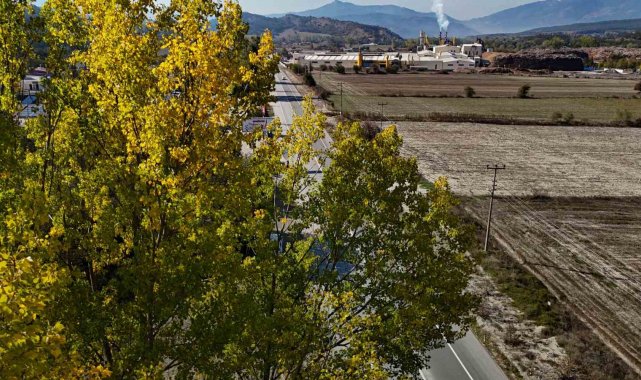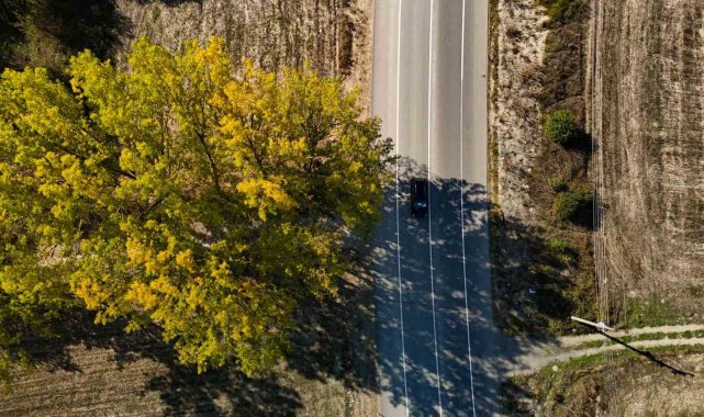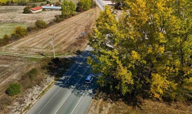 Bolu-Mudurnu kara yolunda, ağaçlar sarı, turuncu ve kızıl tonlara büründü. Yaprak dökümünün başladığı bölgede, doğayla iç içe ilerleyen sürücüler sonbaharın tüm renklerini aynı anda görüyor. Ormanlık alanlardan geçen yolda, renk cümbüşü havadan da görüntülendi. Seyir halindeki araçlar, sararan ağaçların arasından geçerken film sahnelerini aratmayan görüntüler oluşturdu.