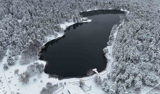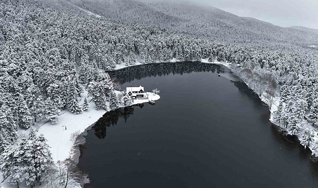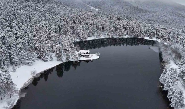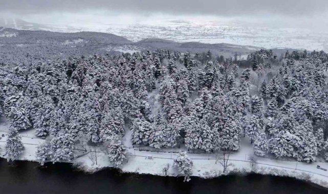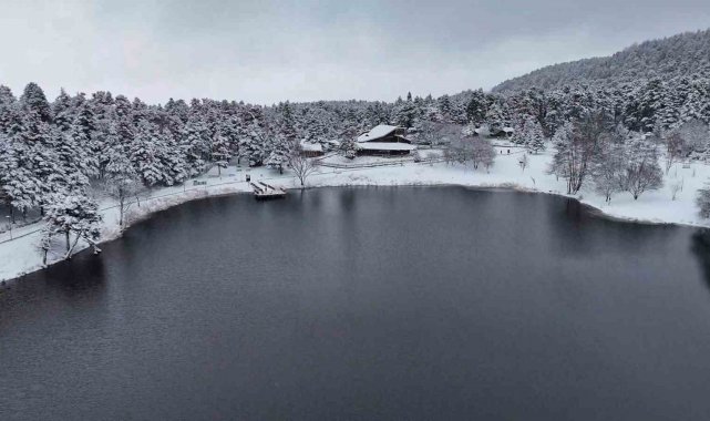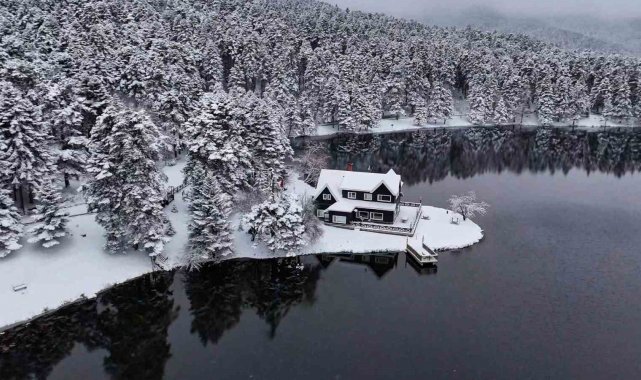 Bolu kent merkezine yaklaşık 13 kilometre uzaklıkta bulunan ve her mevsim yerli ve yabancı turistlerin uğrak noktası olan Gölcük Tabiat Parkı'nda, etkili olan kar yağışı sonrası seyrine doyumsuz manzaralar oluştu. Hava sıcaklığının sıfırın altına düştüğü bölgede, gölün çevresini saran çam ormanları ve simge haline gelen Devlet Konukevi tamamen beyaza büründü. 'Beyaz gelinliğini' giyen tabiat parkı, havadan dron ile görüntülendi. Ortaya çıkan kartpostallık manzaralar, görenleri hayran bıraktı.