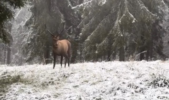 Bolu'nun yüksek kesimlerinde karla kaplı ormanlarda kızılgeyik objektiflere yansıdı. Karların arasında yürüyen geyiğin böğürme anları doğaseverlerin kamerasına takıldı. Soğuk havaların etkili olduğu Bolu'da kızılgeyik görüntülendi. Kar örtüsü üzerinde yürüyen geyiğin, çevreyi inleterek böğürdüğü anlar cep telefonu kamerasına kaydedildi.