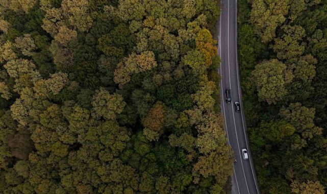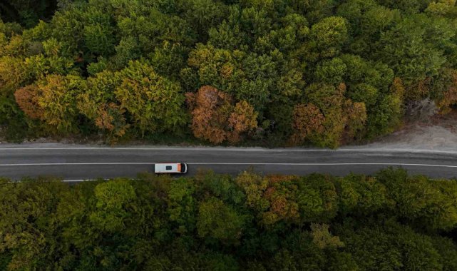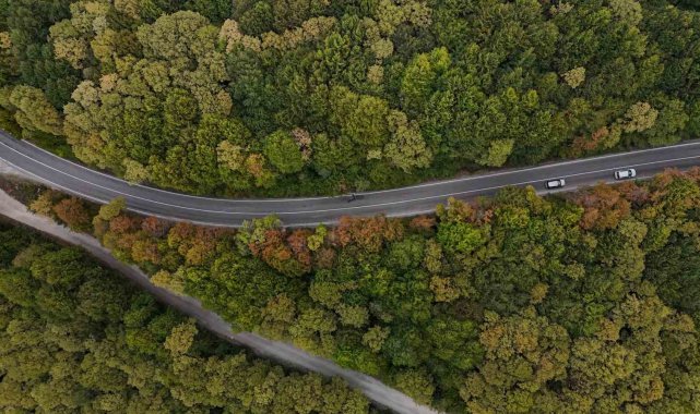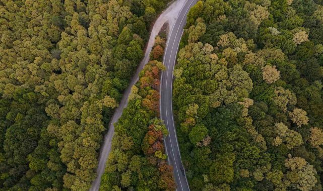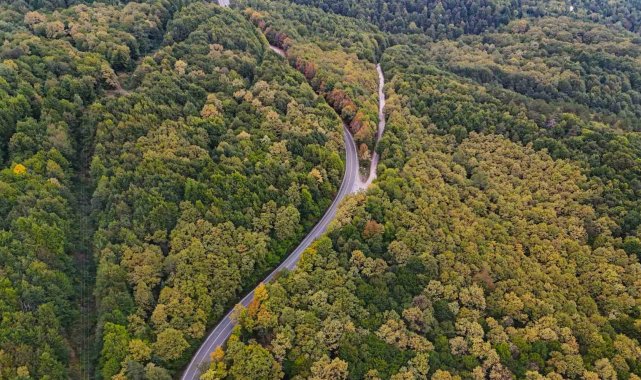 Bolu-Seben kara yolunda sonbaharın gelmesiyle ağaçlar sarı ve turuncu renklere büründü. Dronla kaydedilen görüntülerde ortaya kartpostallık manzaralar çıktı.