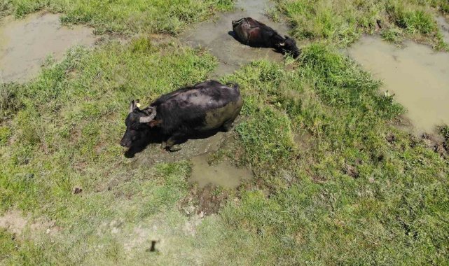 Bolu'da hava sıcaklıklarının mevsim normallerinin üzerinde seyretmesi, yaylalarda bulunan büyükbaş hayvanları da bunalttı. Serinlemek için sulak alan arayan mandalar çareyi derelerde buldu. Mandaların çamur banyosu havadan da görüntülendi.